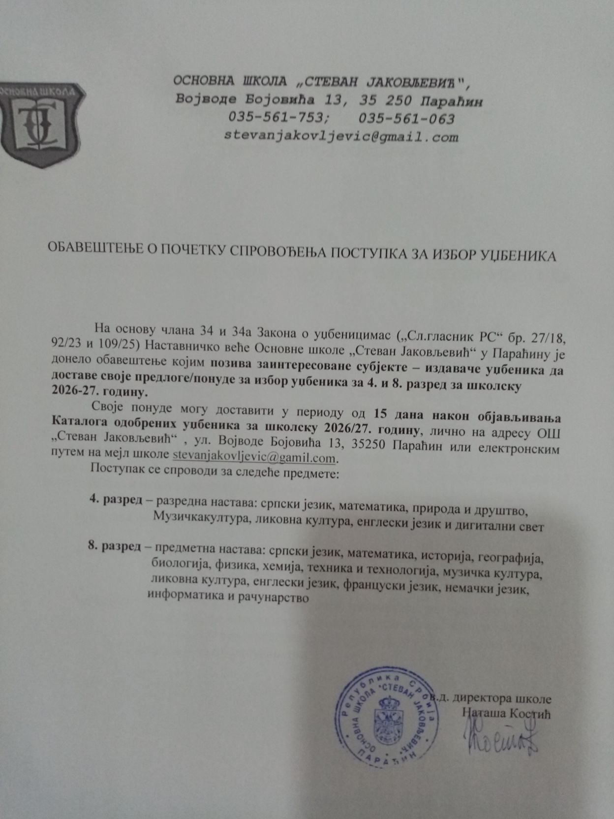Понуде се могу доставити у периоду од 15 дана након објављивања Каталога одобрених уџбеника за школску 2026/27. годину. Понуде се могу доставити лично на адресу: ОШ "Стеван Јаковљевић", улица Војводе Бојовића 13, 35250 Параћин.
